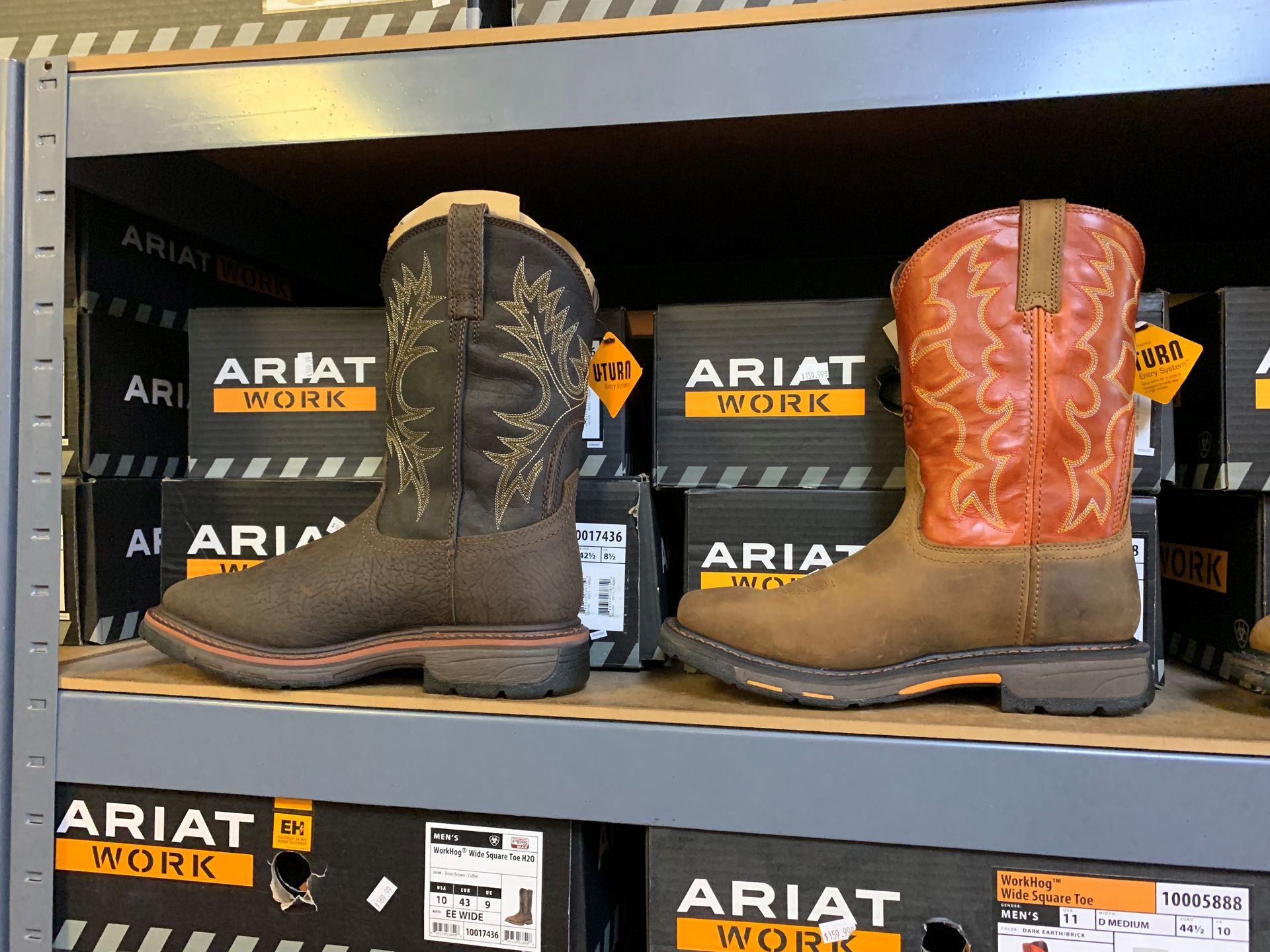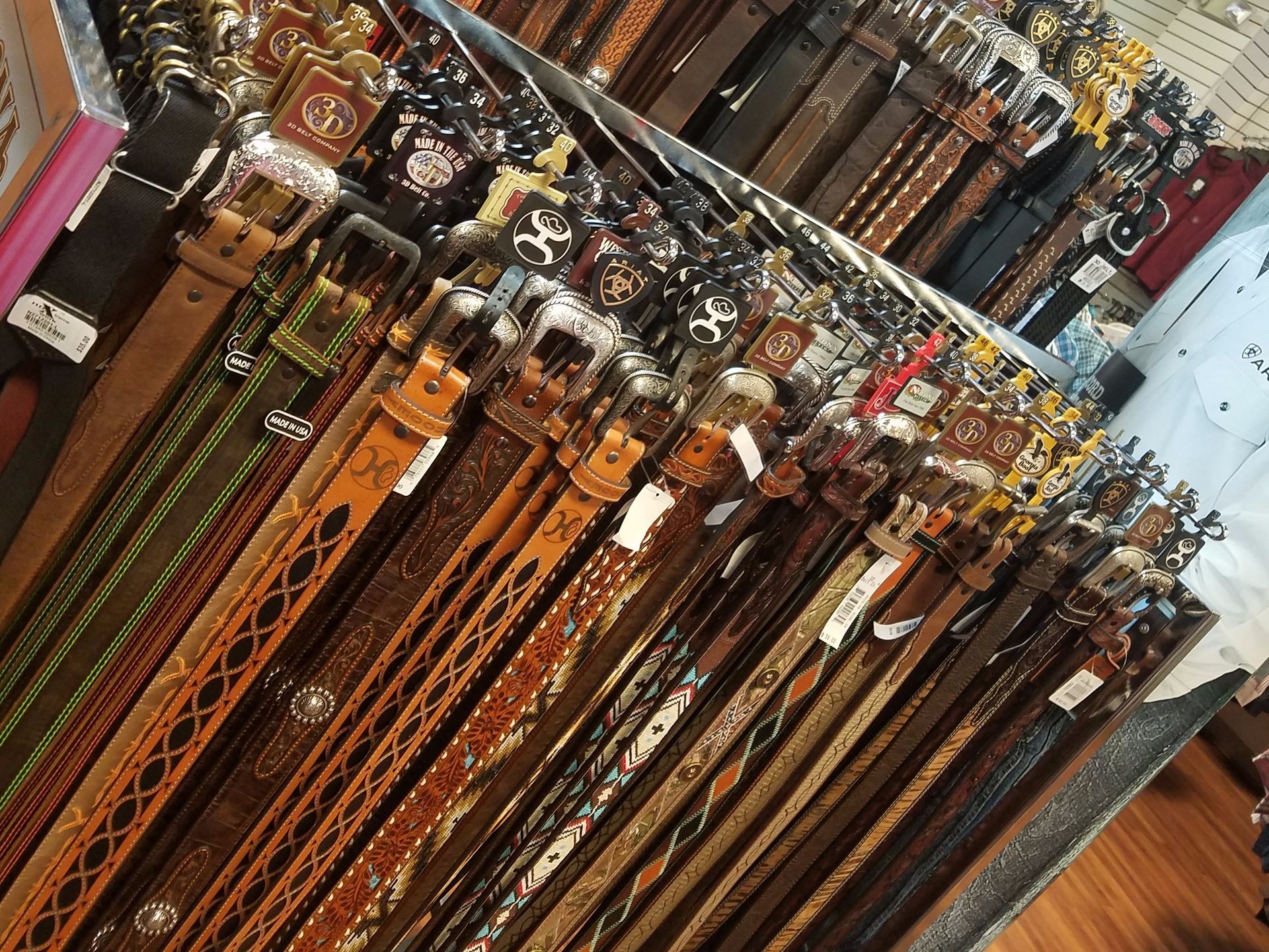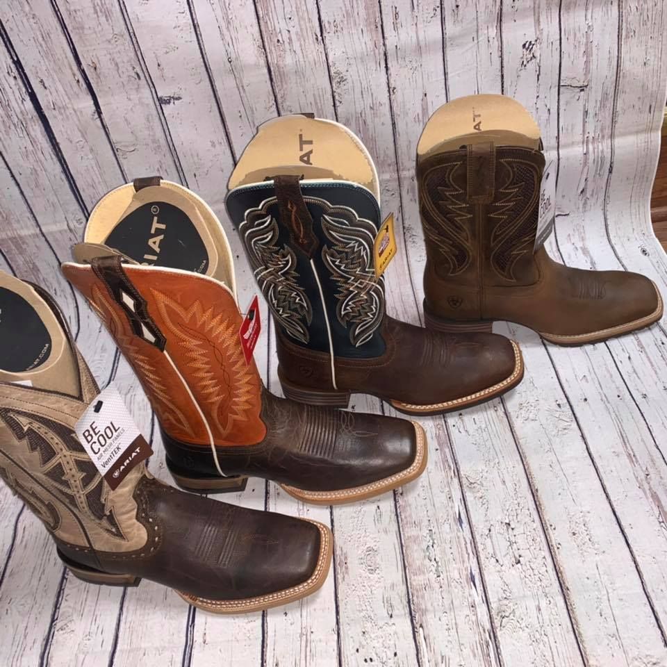 Ariat, Justin Boots, Tony Lama, Nocona, Durango, Rocky, Red Wing, Wolverine, Carolina, Double H, Wrangler, Cinch, Rock n' Roll, Carhartt, Miss Me, Cowgirl Tuff, Roper, Tin Haul, Resistol, Stetson, Charlie One Horse, American Hats, M & F, 3D Belt Company, Montana Silversmiths, Tru Fragrance, Cowboy Up